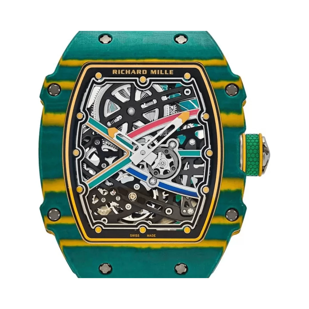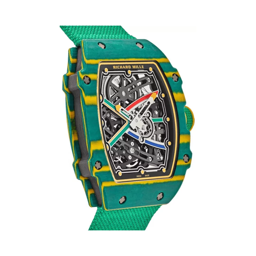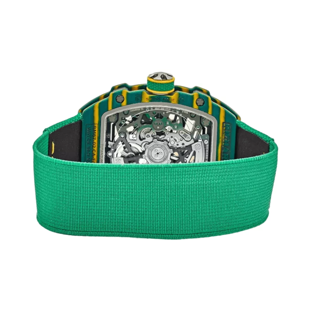 The Richard Mille RM 67-02 CA-FQ is a standout timepiece that blends bold design with cutting-edge engineering. Designed as a unisex model within the Wayde Van Niekerk collection, it features a striking green and yellow Quartz TPT case paired with a flexible green elastic strap for maximum comfort.